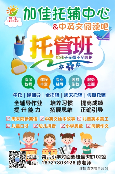 加佳托輔班有十三年的歷程,專注于輔導(dǎo)學習和培養(yǎng)習慣,良好人格塑造。以家庭的的模式給孩子家庭的溫暖!